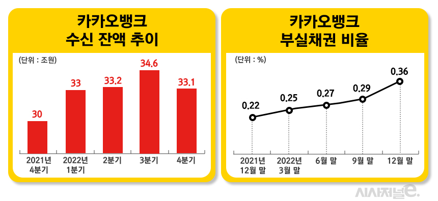 [시사저널e=유길연 기자] 카카오뱅크가 지난해 역대급 실적을 거뒀지만 해결해야 할 과제도 만만치 않다. 우선 지난해 5월부터 강화된 예대율 규제에 대비하기 위해 수신액을 늘려야 할 필요가 있다. 또 중·저신용자 대출 급증의 영향으로 악화되고 있는 자산건전성 개선에도 힘써야 한다. 마지막으로 위축된 플랫폼수익을 회복해야 한다는 지적도 나온다.
