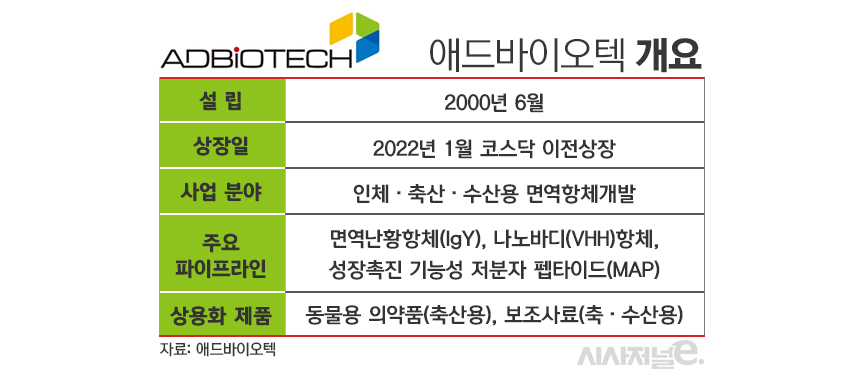애드바이오텍은 인체·동물용 면역항체를 개발하는 바이오 기업이다. 주요 파이프라인으로는 면역난황항체(IgY), 나노바디(VHH)항체, 성장촉진 기능성 저분자 펩타이드(MAP) 기술로, 동물의약품과 보조사료를 개발해 판매 중이다. 현재 애드바이오텍의 매출 대부분이 여기서 발생한다. 애드바이오텍의 핵심 기술인 IgY는 계란 노른자에서 추출한 면역항체로, 백신과 항생제를 대체할 수 있는 축산, 수산, 인체용 면역항체로 활용도가 높다.
