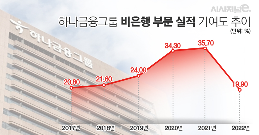 14일 업계에 따르면 하나금융그룹 비은행 계열사의 그룹 순익 기여도는 지난해 19.9%를 기록했다. 비은행 비중만 보면 증권사·보험사가 없는 우리금융그룹(16.1%)과 비슷한 수준이다. 하나금융의 비은행부문 기여도는 2017년 20.8%을 시작으로 2018년 21.6%, 2019년 24.0%, 2020년 34.3%, 2021년 35.7%에 이르기까지 줄곧 성장세를 유지했지만 지난해에는 20% 아래로 추락했다.