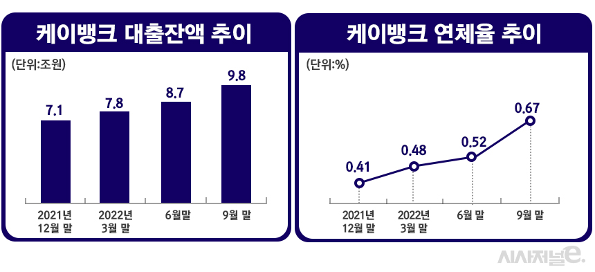 케이뱅크도 지난해 자산건전성이 꾸준히 악화됐다. 9월 말 연체율은 0.67%로 전년 말 대비 0.26%포인트 크게 올랐다. 전체 대출 중 부실채권(고정이하여신)이 차지하는 비율은 같은 기간 0.25%포인트 상승한 0.76%를 기록했다. 4분기에는 이보다 더 악화됐을 가능성이 크다. 당국의 권고에 따라 신용점수(KCB) 820점 이하의 중저신용자들에게 대출을 대거 내준 영향이다.