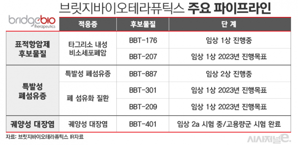 브릿지바이오의 파이프라인 확장 등이 주목되는 배경이다. 브릿지바이오의 주요 파이프라인은 ▲BBT-176(표적항암제 후보물질, 타그리소 내성 비소세포폐암 적응증) ▲BBT-207(표적항암제 후보물질, 타그리소 내성 비소세포폐암 적응증) ▲BBT-877(특발성 폐섬유증 후보물질, 특발성 폐섬유증 적응증) ▲BBT-301(특발성 폐섬유증 후보물질, 폐 섬유화 질환 적응증) ▲BBT-209(특발성 폐섬유증 후보물질, 폐 섬유화 질환 적응증) 그리고 ▲BBT-401(궤양성 대장염 후보물질, 궤양성 대장염 적응증)까지 총 6개다.