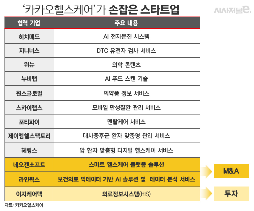 카카오헬스케어는 출범 한 달 만인 지난해 4월 AI 전자문진 시스템 기업 '히치메드'를 시작으로 DCT(소비자 직접 의뢰) 유전자 검사 플랫폼 '지니너스', 의학 콘텐츠를 제공하는 '위뉴', 의약품 정보 서비스 업체 '원스글로벌' 등 10여곳과 MOU를 체결했다.