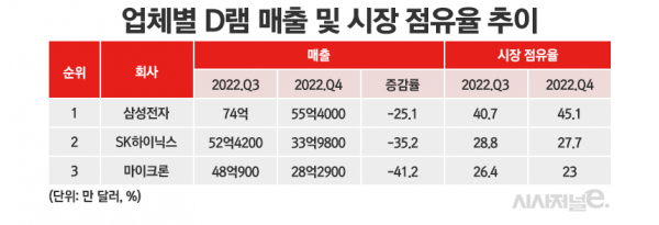 마이크론 매출도 3분기 48억900만달러(6조2700억원)에서 4분기 28억2900만달러(3조6890억원)로 41.2% 감소했다. 마이크론의 매출 감소폭은 주요 D램 업체 가운데 가장 컸다. 점유율도 26.4%에서 23%로 낮아졌다. 3사 이외 대만 난야, 윈본드, PSMC의 지난해 4분기 매출은 전 분기 대비 각각 30%, 30.3%, 39.5% 감소했다.