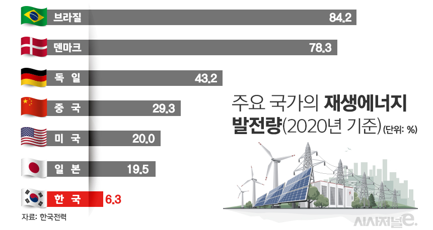 국내 기업들의 RE100 선언이 늘어나고는 있지만, 국내 재생에너지 발전량은 전 세계적으로 현저히 낮다. 2020년 기준 한국의 재생에너지 발전량은 전체의 6.3%에 불과했다. 브라질은 84.2%, 덴마크 78.3%, 캐나다 67.9%, 스웨덴 66.4%이 가장 높았고, 중국, 미국, 일본도 각각 29.3%, 20.0%, 19.5%로 한국과 큰 차이로 높았다.