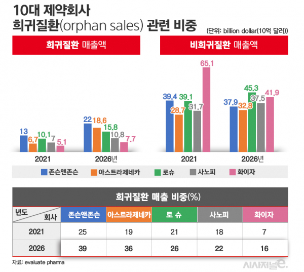 아스트라제네카 역시 희귀의약품 매출 비중이 2021년 19%에서 2026년 36%로 크게 확대될 전망이다. 로슈, 애브비, 사노피, 다케다, 화이자 모두 희귀의약품 매출 비중이 확대될 것으로 이밸류에이트 파마는 내다봤다.
