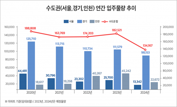 대규모 입주 물량이 대기하고 있다는 점도 전세가격 하락세를 자극할 만한 요인으로 꼽힌다. 부동산인포에 따르면 올해 수도권 전세 물량(아파트 기준, 임대 포함)은 18만2521가구로 지난해 17만4203가구 대비 4.8% 증가했다. 지역별로 보면 ▲서울 2만5700가구 ▲경기 11만1579가구 ▲인천 4만5242가구 등이다. 서울에선 강남이 대규모 입주장을 앞두고 있다. 2023~2024년 입주 예정 물량만 3만2911가구에 달한다.