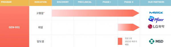 지놈앤컴퍼니는 현재 담도암과 위암 치료제로 개발 중인 GEN-001에 대해 2건의 국내 임상을 진행 중이다. 독일 머크/화이자의 바벤시오와 위암 임상 2상 공동연구를 진행하고 있으며, 미국 머크의 키트루다와 담도암 임상 2상 공동연구도 진행 중이다.