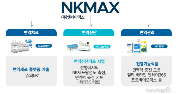 엔케이맥스는 면역세포인 NK세포 관련 ‘종합면역’ 사이클을 제공하는 기업이다. 면역 치료부터 면역 진단·관리까지 제공한다는 목표다. 면역 관련 사업으로 크게 ▲면역세포치료제 ▲사업면역진단키트 ▲건강기능식품 판매 사업 등 진행하고 있다. 면역세포치료제 사업은 체내 면역 세포 중 하나인 NK세포를 활용, 암 등 다수의 난치질환을 대상으로 한 치료제 연구개발과 제조 사업이다.