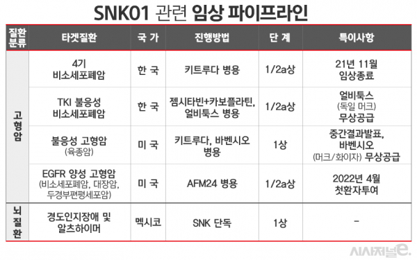 이같은 NK세포를 이용한 면역세포치료제 플랫폼 기술 'SuperNK(슈퍼NK)’로 암을 비롯해 자가면역질환인 건선, 알츠하이머병을 대상으로 임상을 진행 중이다. 슈퍼NK 파이프라인으로는 ‘SNK01’, ‘SNK02’, ‘SNK03’등이 있다. 특히 'SNK01'은 미국, 한국, 멕시코에서 3건의 임상시험을 실시 중이다.