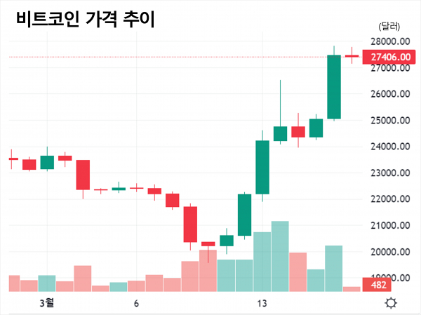 [시사저널e=길해성 기자] 금융위기로 글로벌 자산시장이 일제히 하락하고 있으나 가장자산은 강세를 나타내고 있다. 최근 일주일 새 비트코인과 이더리움은 각각 36%, 25% 급등했다. 글로벌 금융위기 재발에 대한 우려가 커지며 가상자산이 피난처로 떠오른 것으로 풀이된다.