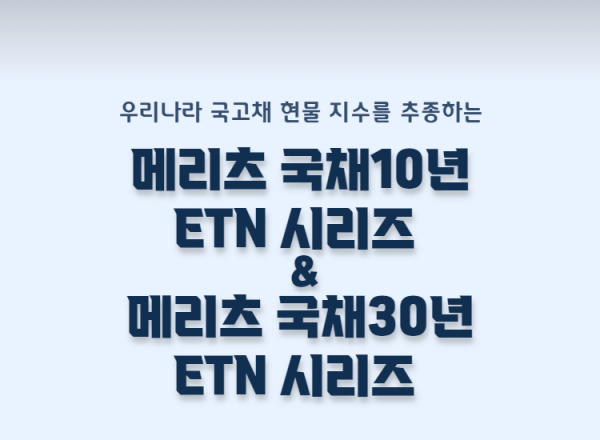 ‘메리츠 국채10년 ETN’ 4종은 대표적인 장기국채인 국고채 10년물 3개 종목으로 산출한 기초지수에 각각 1배와 2배, 그리고 인버스 형태로 1배와 2배 투자가 가능한 상품이다. ‘메리츠 국채30년 ETN’ 4종도 국고채 30년물 3개 종목으로 산출한 기초지수에 각각 1배와 2배로 투자하는 상품이다. 장기 이자 수익을 추구하거나, 주식 포트폴리오의 위험을 분산하고 싶은 투자자들에게 적합하다. 장외시장에서 기관 중심으로 거래되는 국고채를 개인 투자자들도 소액으로 간편하게 투자할 수 있게 됐다.