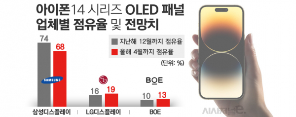 다음달 1개월 기준 점유율 전망치는 삼성디스플레이 43%, LG디스플레이 33%, BOE 24%로 더 좁혀질 전망이다. LG디스플레이는 지난해 아이폰14 프로맥스용 LTPO 패널을 애플에 공급한 뒤부터 물량을 늘리고 있다. BOE는 가격 경쟁력을 앞세워 점유율을 높이고 있어 삼성디스플레이 입지는 위축될 것으로 관측된다.