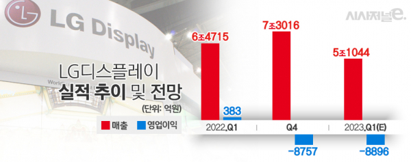 시장조사업체 에프앤가이드에 따르면 LG디스플레이의 1분기 영업손실 전망치는 8896억원이다. 전 분기 적자(-8757억원)보다 영업손실 규모가 더 커진단 예측이다.