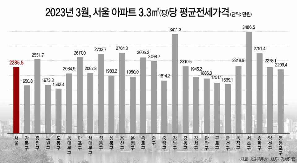 서울 25개 자치구에서 전셋값이 가장 큰 폭으로 떨어진 곳은 강남구다. 강남구는 지난 1월 3.3㎡당 평균 전세가격이 3700만7000원이었지만 지난달 3411만3000원으로 289만4000원(-7.8%) 하락했다. 이에 따라 이달 전국 아파트 평균 전셋값 1위 자리도 강남구에서 서초구(3486만5000원)로 바뀌었다.