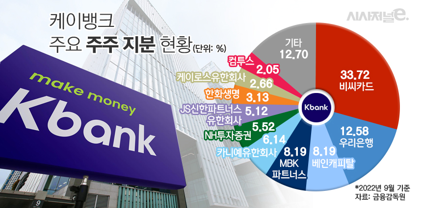 이런 상황을 고려하면 케이뱅크의 올해 상장이 쉽진 않을 것으로 전망된다는 것이 업계의 시각이다. 지난해 9월 기준 케이뱅크는 KT의 금융계열사인 비씨카드가 최대주주(지분율 약 33.72%)다. 비씨카드는 2020년 대주주 적격성 문제를 넘지 못한 KT의 케이뱅크 보유지분을 인수하며 최대 주주로 올라섰다. 이외에 ▲우리은행(12.6%) ▲베인캐피탕(8.19%) ▲MBK파트너스(8.19%) ▲카니예유한회사(6.14%) ▲NH투자증권(5.52%) ▲JS신한파트너스유한회사(5.12%) ▲한화생명(3.13%) ▲케이로스유한회사(2.66%) ▲컴투스(2.05%) ▲기타(12.70%) 등이 지분을 각각 보유하고 있다.
