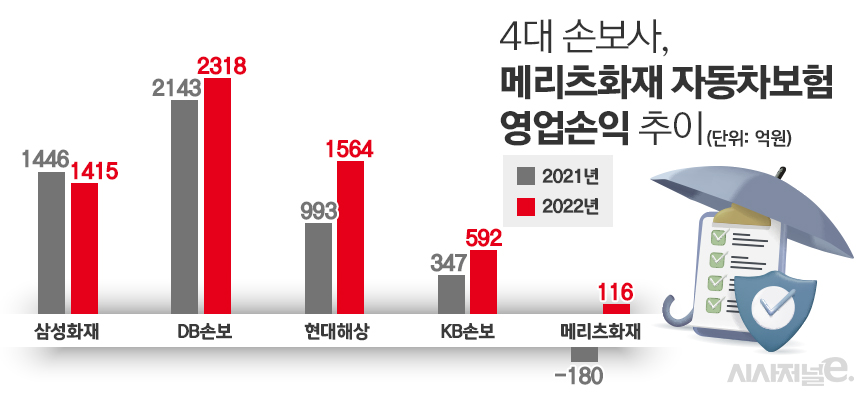 6일 금융권에 따르면 메리츠화재는 지난해 자동차보험 사업 부문에서 116억원의 영업이익을 올렸다. 1년 전인 2021년(-180억원)까지 계속 손실을 보다가 작년에 흑자 전환했다. 자산규모 상위 4개 손보사들의 이익 규모는 더 컸다. 삼성화재는 1415억원, 현대해상은 1564억원, DB손보는 2318억원, KB손보는 592억원의 영업이익을 기록했다. 그 결과 전체 손보사들이 거둔 자동차보험 영업이익은 4780억원으로 전년 대비 20.1% 급증했다.