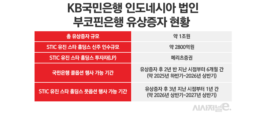 [시사저널e=유길연 기자] KB국민은행 인도네시아 법인 부코핀은행의 1조원 규모의 유상증자에 메리츠증권이 참여하면서 경영정상화의 전망을 밝게 했다. 새 주주와 맺은 계약에 포함된 옵션도 오는 2025년까지 부코핀은행을 흑자 기업으로 만들겠다는 국민은행의 의지가 반영됐다는 해석이 나온다. 부코핀은행이 이익을 내 주가가 상승세를 그리면 국민은행은 옵션을 행사해 새 주주들의 지분을 인수할 근거가 마련된다. 하지만 부코핀은행이 정상화되지 못하면 이번 주주 간 계약은 더 큰 고민으로 돌아올 것이란 전망도 제기된다.