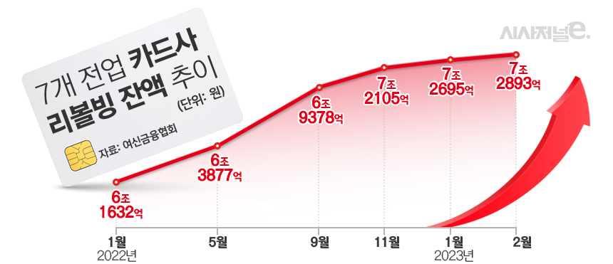 13일 업계에 따르면 주요 카드사 7곳(롯데·삼성·신한·우리·하나·현대·KB국민카드)의 지난 2월 말 기준 리볼빙 잔액은 7조2893억원으로 집계됐다. 이는 전월 대비 198억원 증가한 규모다. 리볼빙 잔액 증가세는 지난해 12월 516억원, 1월 73억원으로 점차 둔화해왔지만 이번 2월 증가 폭에서는 다시 확대되고 있다는 분석이다.