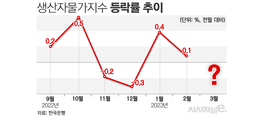 [시사저널e=김태영 기자] 오는 21일 소비자물가지수에 영향을 주는 생산자물가지수 발표를 앞두고 업계가 촉각을 곤두세우고 있다. 두 달 연속 상승세를 보였던 만큼 3월에도 올랐을지 관심이 쏠리고 있다. 도매 물가를 나타내는 생산자물가지수는 소비자 물가의 방향성을 미리 보여주는 선행 지표가 되기 때문에 생산자물가지수가 큰 폭으로 하락한다면 물가 진정 흐름이 보인다는 의미로 해석된다. 생산자물가 지표에 따라 다음달 한국은행 금리정책 향방이 결정될 것이라는 관측이 나온다.