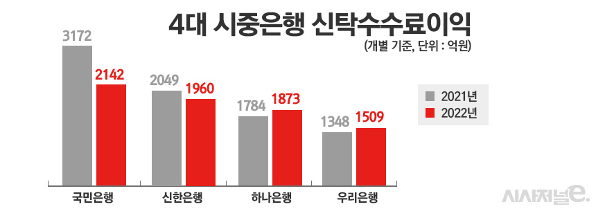그간 앞도적으로 실적 1위를 유지하던 국민은행이 작년에는 타 시중은행의 강한 추격을 받았다. 국민은행은 지난해 ELS 시장의 부진으로 신탁수수료이익(개별 기준)이 2142억원으로 1년 전과 비교해 32% 급감했다. 반면 3, 4위인 하나·우리은행은 오히려 실적이 늘었다. 이에 1위인 국민은행과 4위인 우리은행의 실적 격차도 약 1800억원에서 600억원으로 크게 줄었다.