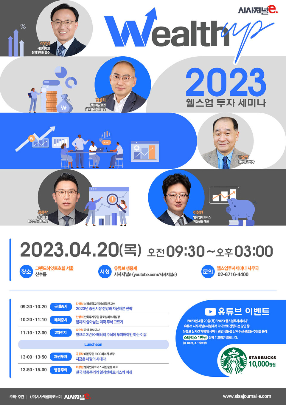 올해로 다섯 번째를 맞는 시사저널e 주최 ‘2023웰스업 투자세미나’(2023 Wealth Up)가 20일 오전 9시 30분부터 서울 용산구에 위치한 그랜드하얏트서울에서 열린다. 이번 투자 세미나는 비대면으로 진행되며 누구나 강연을 들을 수 있게 시사저널e 유튜브 채널(https://www.youtube.com/watch?v=dNUKUc1_vQE)에서 생중계된다.