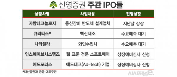 상장 과정에 본격 돌입한 IPO도 두 곳이다. 대신증권과 공동으로 대표 주관 업무를 보고있는 백신 개발업체 큐라티스는 오는 25~26일 상장을 계획하고 있다. 신영증권은 와인업계 1호 상장사 자리를 노리는 나라셀라의 대표 상장 주관도 맡고 있다. 나라셀라는 내달 16~17일 기관 수요예측을 진행할 예정이다.