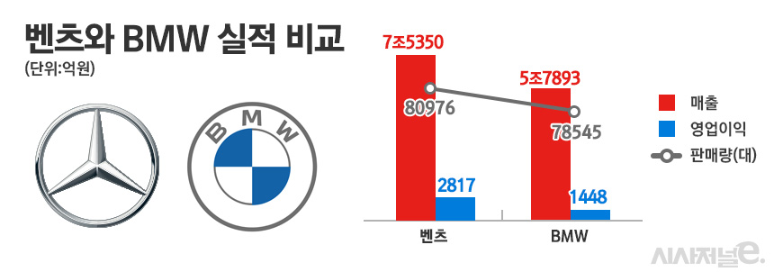 양사 판매량 비슷하지만 영업이익은 2배 차이···벤츠 2800억원대, BMW 1400억원대