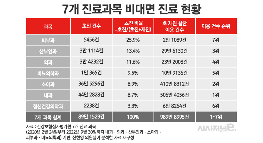 [시사저널e=김지원 기자]비대면 진료에서의 초진 허용 여부를 두고 플랫폼 업계와 당국의 의견이 엇갈리는 가운데, 관련 현황 파악 결과에 대해서도 주체별로 다른 해석을 내놓고 있다. 업계는 초진 비율이 99%라고 밝혔지만, 건강보험심사평가원 자료를 바탕으로 7개 과목(내과·외과·산부인과·소아과·피부과·비뇨의학과)에 대해 신현영 더불어민주당 의원이 내놓은 결과에 따르면 초진 비율은 9%로 나타났다. 비대면 진료 제도화를 위한 체계적 데이터 분석이 요구된다.