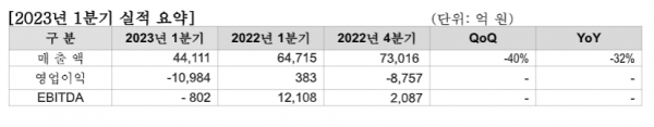 [시사저널e=이호길 기자] LG디스플레이가 지난 1분기 연결 기준 매출 4조4111억원, 영업손실 1조984억원을 기록했다고 26일 밝혔다. 매출은 전년 동기 대비 31.8% 줄었고, 영업이익은 적자 전환했다. 지난해 2분기 이후 4개 분기 연속 적자로 영업손실 폭도 전 분기(8757억원)보다 확대됐다.