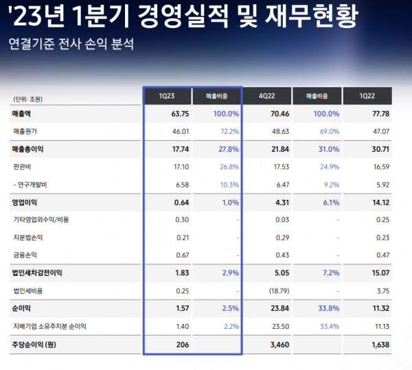 지난 1분기 연결 기준 실적은 매출 63조7500억원, 영업이익 6400억원이다. 매출과 영업이익은 전년 동기 대비 각각 18%, 95.5% 감소했다. 글로벌 경기 불확실성과 경기둔화 우려에 소비심리가 위축돼 매출이 줄고, 반도체 공급 과잉에 따른 가격 급락으로 수익성도 크게 감소했다.