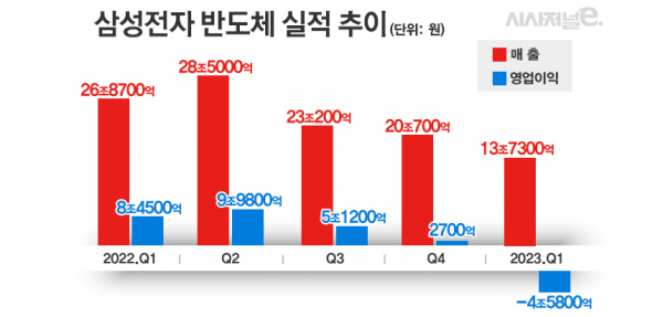 삼성전자는 27일 실적 발표 컨퍼런스콜을 열고 지난 1분기 D램 평균판매가격(ASP)이 전 분기 대비 10% 중반, 낸드플래시는 10% 후반 수준으로 하락했다고 설명했다. 수요 위축에 따른 재고 증가와 가격 하락으로 전 분기 낸드 제품에 반영된 재고평가손실은 이번에 D램으로 확대됐다. 삼성전자 디바이스솔루션(DS) 부문의 1분기 영업손실 규모는 4조5800억원이다. 반도체 사업 분기 적자는 2009년 1분기 이후 14년 만에 처음이다.