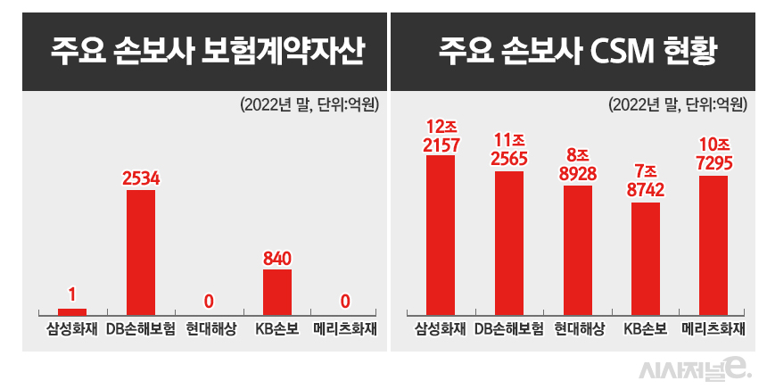 자산이 인식될 정도로 손해율 추정치가 내려가면 그만큼 CSM도 크게 늘어난다. DB손보 외에 일부 중소형 손보사들도 보험계약자산을 인식하면서 예상 밖의 큰 규모의 CSM이 발생했다. 흥국화재, 롯데손해보험은 각각 1700억원, 1625억원의 보험계약자산을 인식했다. 그 결과 두 손보사의 CSM은 각각 2조2000억원, 1조8000억원 정도를 기록했다. 보험사 규모에 비해 CSM이 크다는 평가가 나온다.