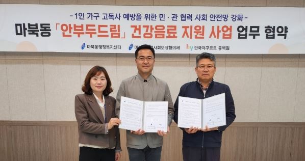 이번 협약을 통해, 마북동 지보체와 hy동백점은 고독사 예방을 위해 건강 음료를 지원하고 선정된 홀몸 어르신, 중증 장애인 10가구의 안부를 살핀다.