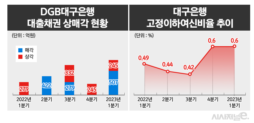 올해 1분기 대구은행이 매각한 대출채권의 규모는 507억원이었다. 지난해 전체 규모 대비 72%에 해당하는 규모다. 부실채권을 상각한 규모도 245억원에 달했다. 이렇게 부실채권을 대규모로 처분했는데도 대구은행의 자산건전성은 나아지지 않았다. 1분기 말 기준 부실채권 비율(고정이하여신비율)은 0.6으로 작년 말과 같은 수준을 유지했다. 대규모 대출채권 처분이 없었으면 자산건전성이 크게 악화됐을 것이란 의미다.