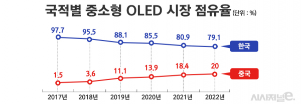 30일 한국디스플레이산업협회의 ‘디스플레이 산업 주요 통계’에 따르면 지난해 중국의 중소형 OLED 시장 점유율(금액 기준)은 20%로 전년 대비 1.6%포인트 상승했다. 한국은 80.9%에서 79.1%로 낮아졌다. 아직 양국 격차는 크지만, 점유율 차이는 소폭 좁혀졌다.