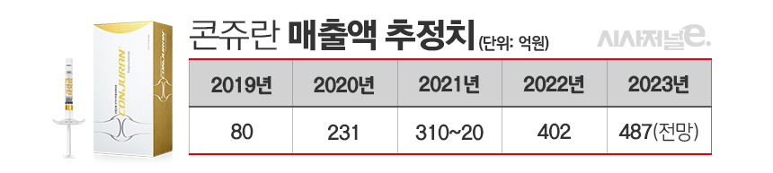 특히 콘쥬란은 2020년 건강보험에 등재되며 매출이 크게 증가했다. 2019년 1월 출시 당시 비급여로 20만 원이었던 콘쥬란 시술비는 건강보험 급여 적용으로 4만 5000원이 됐다. 6개월에 5회까지 건강보험 적용이 가능함에 따라 매출도 증가한 것으로 나타났다. 금융투자업계에 따르면 콘쥬란의 출시 첫해인 2019년 매출액은 70~80억 원이다. 건강보험이 등재된 2020년엔 231억 원으로 증가했다는 분석이다.