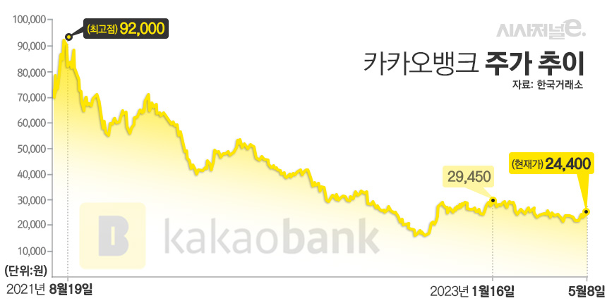 현재 카카오뱅크는 3개월 주가 수익률은 13.4% 하락한 상태다. 상장된 은행주 가운데 3개월 기준으로 낙폭이 가장 크다. 지난 3월 8일 2만8200원에 거래를 마친 카카오뱅크 주가는 8일 2만4400원에 마감했다.