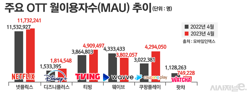 이 기간 넷플릭스와 쿠팡플레이, 디즈니플러스 등의 MAU는 모두 전년 대비 늘면서 각각 1173만2241명과 429만4050명, 181만4548명으로 집계됐다. 반면 왓챠의 MAU는 112만8263명에서 74만9228명으로 감소했다.