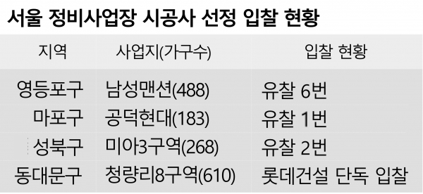 서울 알짜 사업장도 건설사들의 참여가 저조한 실정이다. 서울 지하철 1호선 청량리역과 도보로 5분 거리에 위치한 동대문구 ‘청량리8구역’(610가구)은 올해 두 차례 시공사 선정을 위한 입찰에 나섰지만 롯데건설만 단독으로 참여해 모두 유찰됐다. 노량진뉴타운 최대어로 불리는 ‘노량진1구역’(2337가구)도 삼성물산과 GS건설 두 곳만 관심을 나타내고 있다. 이곳은 컨소시엄 구성이 불가해 두 곳 중 한 곳이 단독 입찰할 가능성도 점쳐진다.