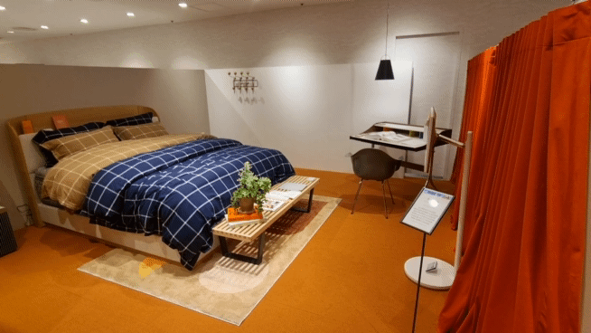주방에 이어 ‘리빙룸’ 공간은 GS건설의 DMC 아트포레자이 약 25평(84㎡) 크기의 거실과 침실 구조를 실제와 동일하게 구현했다. 고객 취향에 따라 새로운 스타일링이 가능하고, 최근 유행하는 모듈가구 USM을 중심으로 삼성TV와 허먼밀러 라운지 체어를 조합해 눈길을 끌었다. 리빙센스에 따르면 GS건설의 기존 입주민과 새로운 입주민들에게 롯데백화점 웰컴클럽으로 가구 프로모션을 제공하고, 리빙센스의 시공을 더할 수 있게 했다.