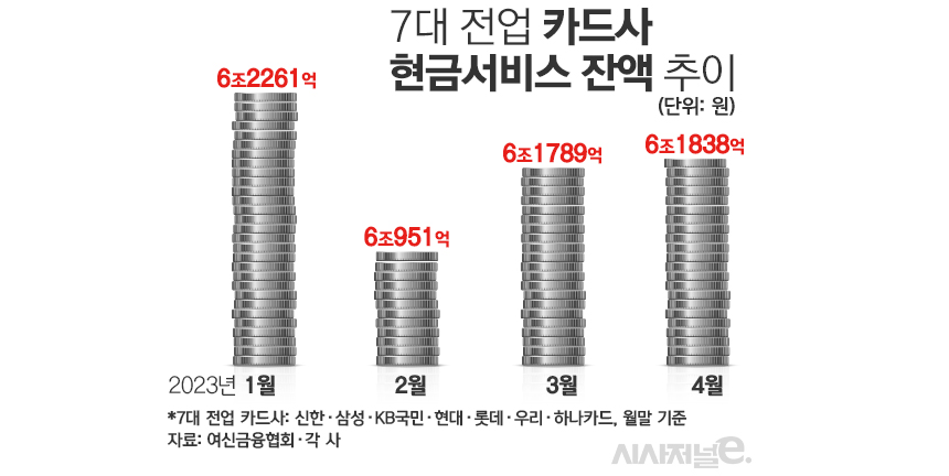 25일 업계에 따르면 7개 주요 전업 카드사(신한·삼성·국민·현대·롯데·우리·하나카드)의 지난달 현금서비스 잔액은 6조1838억원으로 집계됐다. 전월(6조1789억원) 대비 약 50억원 가량이 증가했다. 지난 1월 6조2260억원이던 현금서비스 잔액은 지난 2월 6조951억원으로 감소했다가 지난 3월부터 증가세를 유지하고 있다.