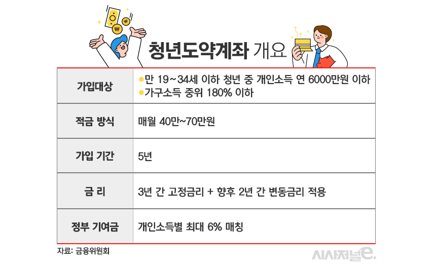 청년도약계좌는 만 19~34세 가입자가 매월 40만∼70만원을 적금 계좌에 납입하면 정부가 월 최대 2만4000원 기여금을 매칭 지원하고 이자소득에 대한 비과세 혜택(15.4%)을 부여한다. 만기는 5년이다. 가입 후 3년 간 고정금리, 이후 2년은 변동금리를 적용한다.