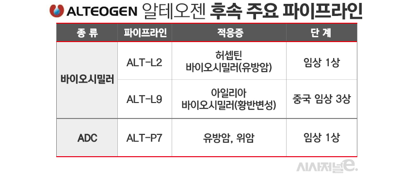 다른 주요 파이프라인으로는 유방암 치료제 허셉틴 바이오시밀러, 안과질환인 황반변성 치료제 아일리아 바이오시밀러, ADC(항체-약물 접합 치료제)등이 있다. 제형 차별화 개량신약과 약물전달 시스템(DDS) 개선 분야에서 영역을 확장할 필요가 있다는 분석도 나오는 가운데, 알테오젠 측은 바이오시밀러를 준비 중이라는 설명이다.