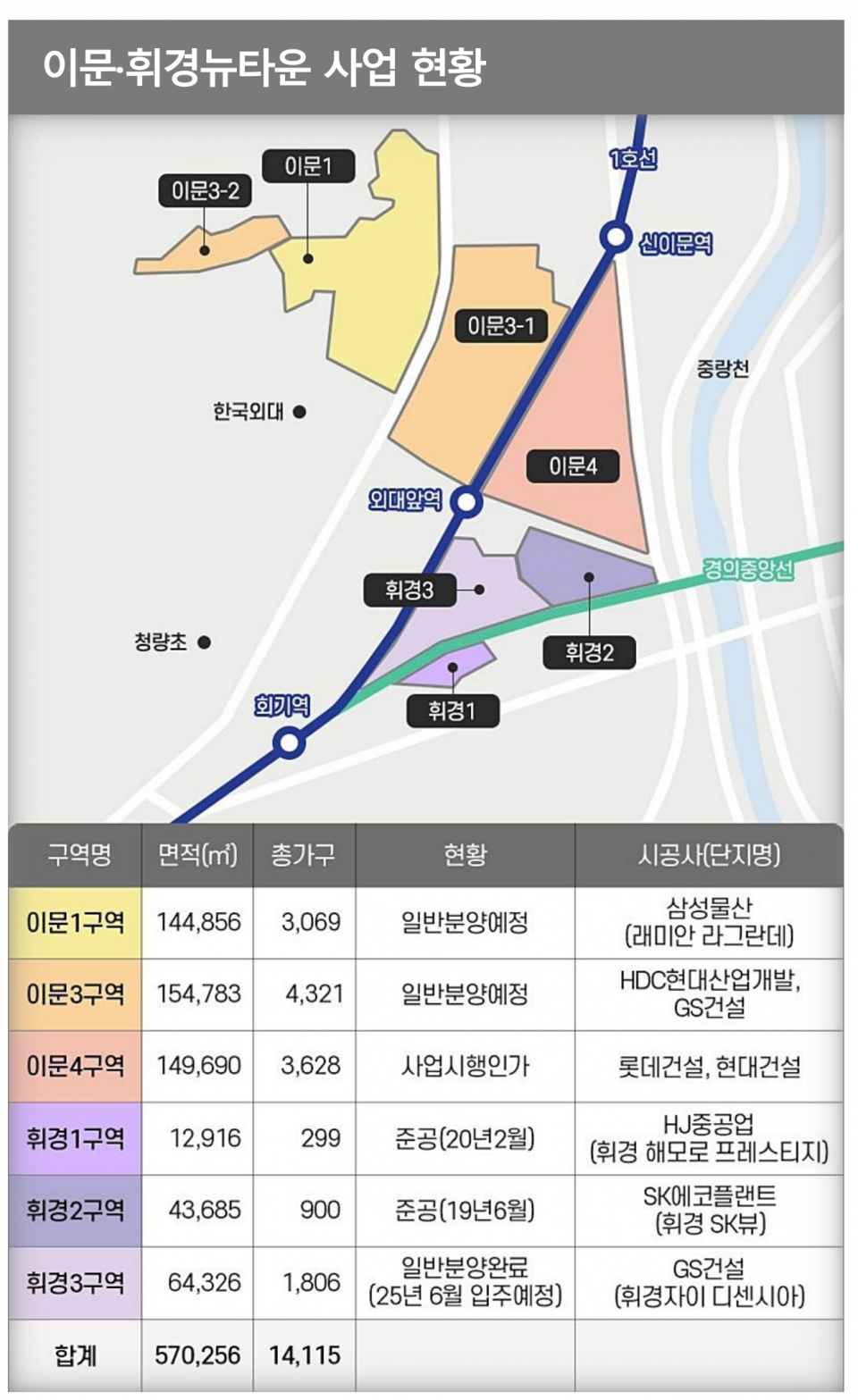 최근 사업이 가장 활발한 곳은 이문·휘경뉴타운이다. 이곳은 2006년 10월 재정비촉진지구로 지정됐지만 서울시 정책 변화와 금융위기 등으로 사업이 지연되다 뒤늦게 속도를 내기 시작했다. 이문1·3·4구역과 휘경1·2·3구역으로 나눠 사업이 진행되고 있다. 2019년 6월 휘경2구역(휘경SK뷰·900가구)에 이어 2021년 3월 휘경1구역(휘경해모로프레스티지·299가구)가 입주민을 받았다. 이문2구역은 주민들의 정비사업 반대로 2014년 9월 뉴타운지구에서 빠졌다.