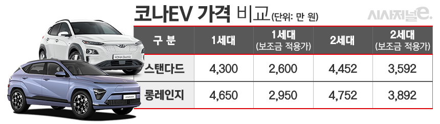 현재 코나EV의 스탠다드모델은 4452만원, 롱레인지 모델은 4752만이다. 1세대 모델과 판매 가격 자체는 비슷하다. 다만 보조금이 눈에 띄게 줄었다. 현재 코나EV엔 국고보조금 680만원, 서울시 보조금 180만원이 제공된다. 보조금 적용 시 스탠다드 모델 3592만원, 롱레인지 모델 3892만원이다. 소형차임을 감안하면 가격 부담이 크다.