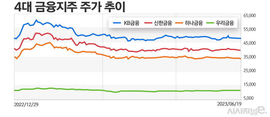 주주환원 확대가 어려울 것으로 예상되는 만큼 금융지주의 주가도 당분간 부진이 이어질 것으로 전망된다. 주요 금융지주의 주가는 올해 초 작년 실적발표를 앞두고 상승세를 탔지만 이후 하향곡선을 그렸다. 금융당국이 은행의 대출 금리 산정에 사실상 개입하는 등 ‘관치 논란’이 일면서 외국인투자자들이 빠져나간 영향이다. 지난 3월부터 3개월간 KB‧신한‧하나‧우리 등 4대 금융지주 주식을 약 1조원 가량 순매도 한 것으로 나타났다.