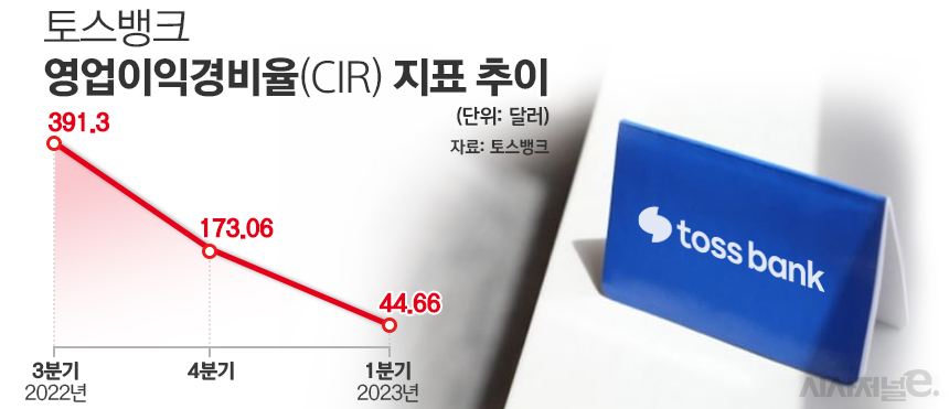 [시사저널e=김태영 기자] 토스뱅크의 적자 탈출이 초읽기에 들어갔다. 손실 폭을 1년 만에 절반 넘게 줄이며 흑자 전환 시점에 업계의 이목이 집중되고 있다. 인터넷전문은행 강점이라 할 수 있는 무(無)점포 효과가 나타나면서 이익 규모가 증가하고 있는 가운데 업계에서는 영업이익경비율(CIR) 지표 변화 추이가 흑자 전환을 가늠할 잣대가 될 것으로 분석하고 있다.