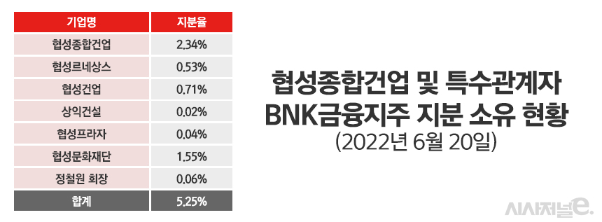 20일 금융권에 따르면 협성종합건업은 BNK금융지주 주식 100만주를 지난 12일부터 19일까지 사들였다. 주당 6908원씩 총 69억원을 투입해 매입했다. 이에 협성종합건업은 특수관계자를 포함해 BNK금융 지분 5.25%를 보유했다. 협성종합건업이 2.34%을 소유하고 정철원 협성종합건설 회장(0.06%)과 함께 계열사 5곳이 나머지 지분을 가지는 구조다.