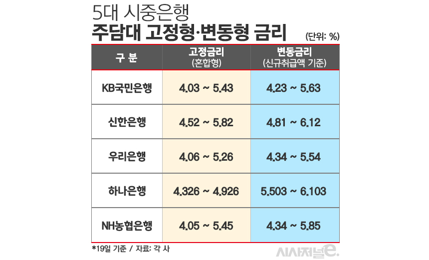 20일 금융권에 따르면 KB국민·신한·우리·하나·NH농협은행 등 5대 시중은행의 전날 기준 주택담보대출 변동금리는 4.23~6.12%로 나타났다. 보름 만에(2일·3.91~6.13%) 하단이 0.32%포인트 올랐다.