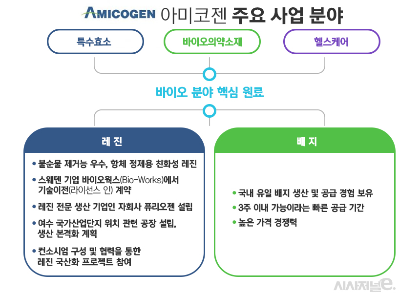 레진은 바이오의약품 정제 과정에 필요한 소재다. 바이오의약품은 생물 등의 원료에서 단백질만 추려내는 작업을 거치는데, 이때 정제 원료인 레진을 사용한다. 아미코젠은 효소와 더불어 바이오제약·레진·배지을 미래 핵심 파이프라인으로 꼽고 관련 사업을 갖춰왔다.
